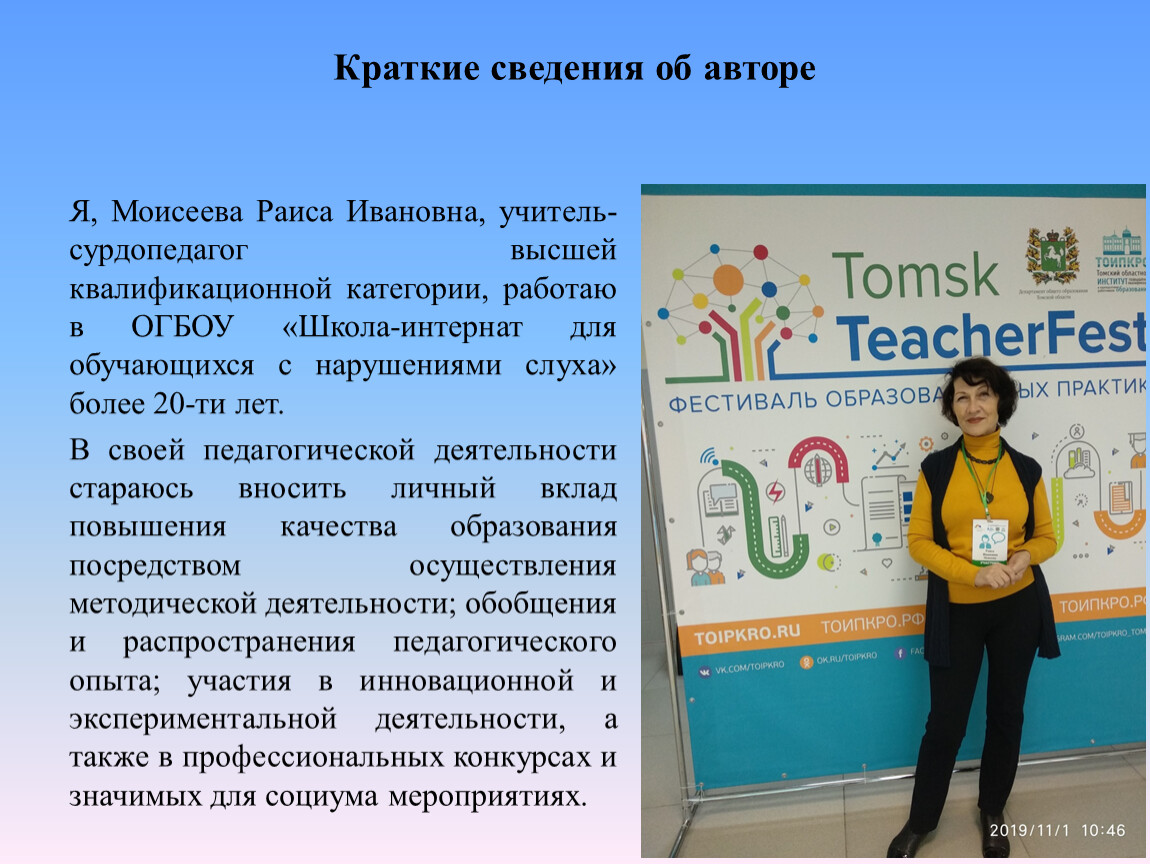 Я, Моисеева Раиса Ивановна, учитель-сурдопедагог высшей квалификационной категории, работаю в ОГБОУ «Школа-интернат для обучающихся с нарушениями слуха» более 20-ти лет.