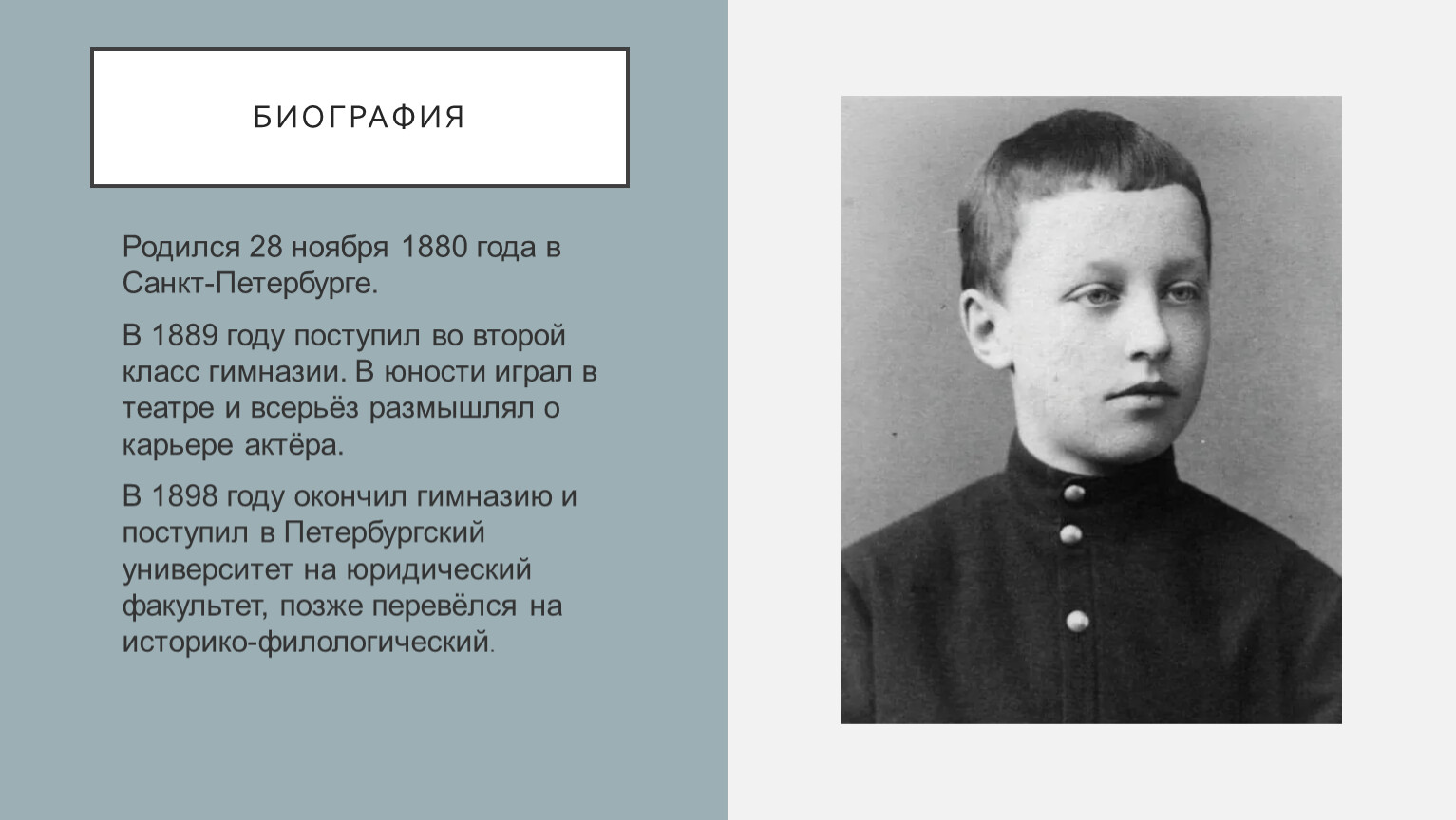 В 1898 году окончил гимназию и поступил в Петербургский университет на юридический факультет, позже перевёлся на историко-филологический.
