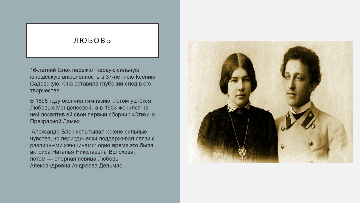 Александр Блок испытывал к жене сильные чувства, но периодически поддерживал связи с различными женщинами: одно время это была актриса Наталья Николаевна Волохова, потом — оперная певица Любовь Александровна Андреева-Дельмас.