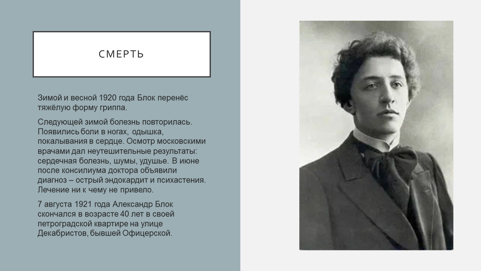 7 августа 1921 года Александр Блок скончался в возрасте 40 лет в своей петроградской квартире на улице Декабристов, бывшей Офицерской.