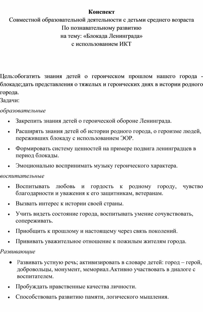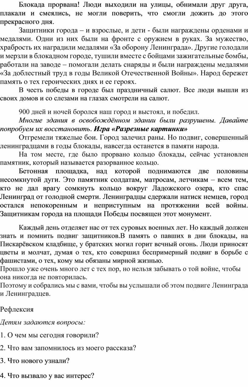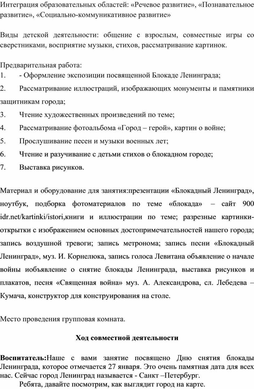 Материал и оборудование для занятия:презентации «Блокадный Ленинград», ноутбук, подборка фотоматериалов по теме «блокада» – сайт 900 idr.net/kartinki/istori,книги и иллюстрации по теме; разрезные картинки-открытки с изображением основных достопримечательностей нашего города; запись воздушной тревоги; запись метронома; запись песни «Блокадный Ленинград», муз. И. Корнелюка, запись голоса Левитана объявление о начале войны иобъявление о снятие блокады Ленинграда, выставка рисунков и плакатов, песня «Священная война» муз. А. Александрова, сл. Лебедева – Кумача, конструктор для конструирования на столе.