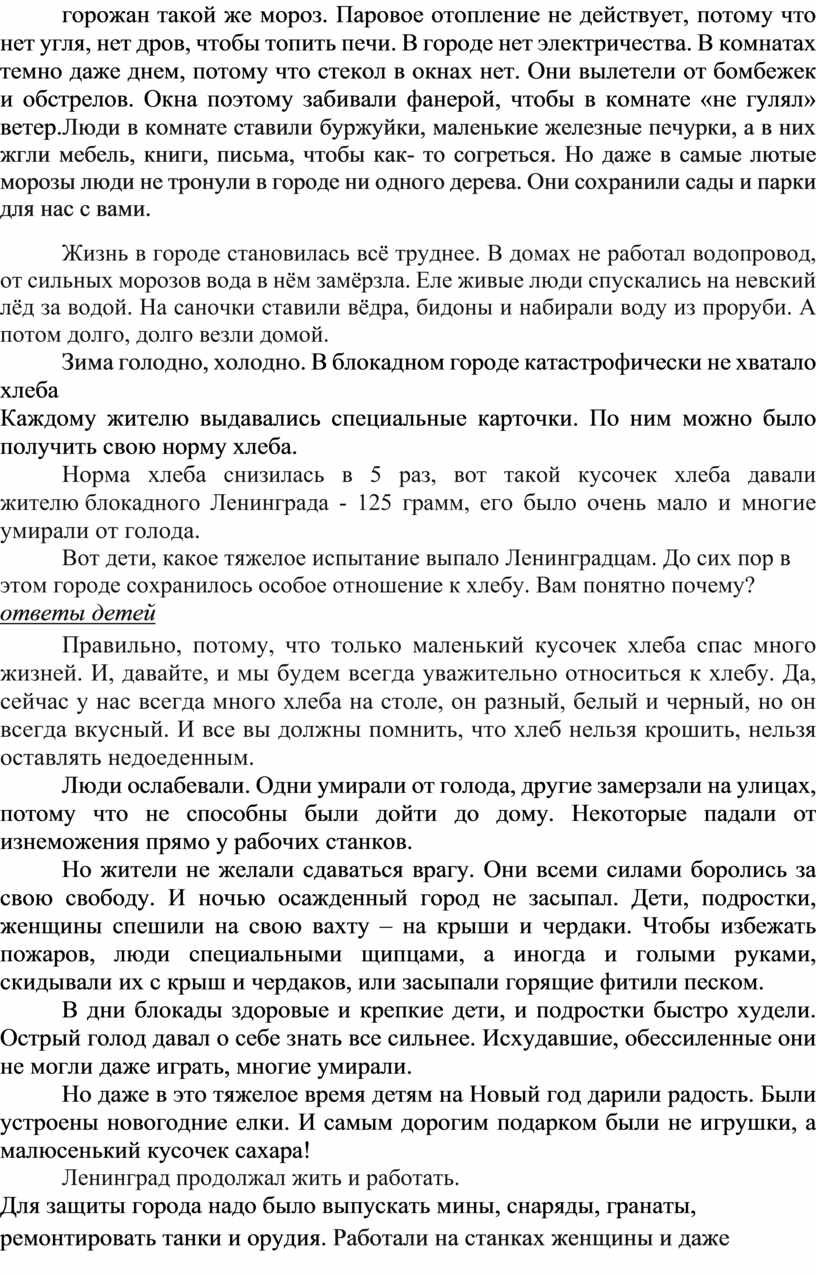 Кроме фашистов на осажденный город наступала зима – в тот год неожиданно суровая и морозная. На улице небывалый мороз. И в домах у горожан такой же мороз. Паровое отопление не действует, потому что нет угля, нет дров, чтобы топить печи. В городе нет электричества. В комнатах темно даже днем, потому что стекол в окнах нет. Они вылетели от бомбежек и обстрелов. Окна поэтому забивали фанерой, чтобы в комнате «не гулял» ветер.Люди в комнате ставили буржуйки, маленькие железные печурки, а в них жгли мебель, книги, письма, чтобы как- то согреться. Но даже в самые лютые морозы люди не тронули в городе ни одного дерева. Они сохранили сады и парки для нас с вами.