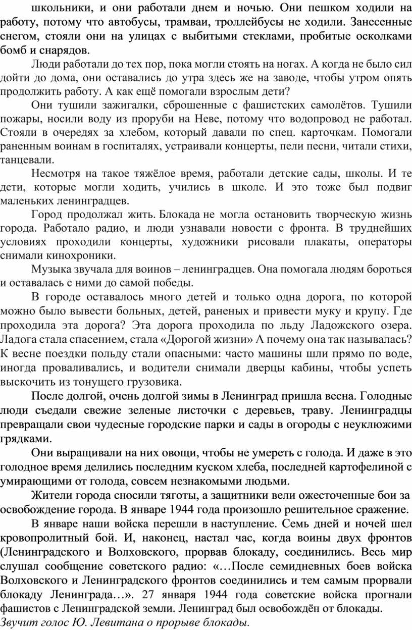 Звучит голос Ю. Левитана о прорыве блокады.