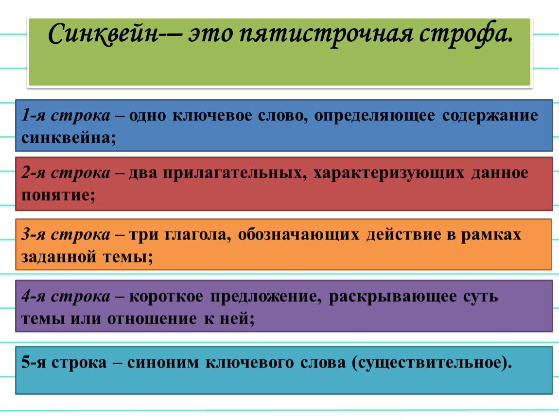 1-я строка – одно ключевое слово, определяющее содержание синквейна;