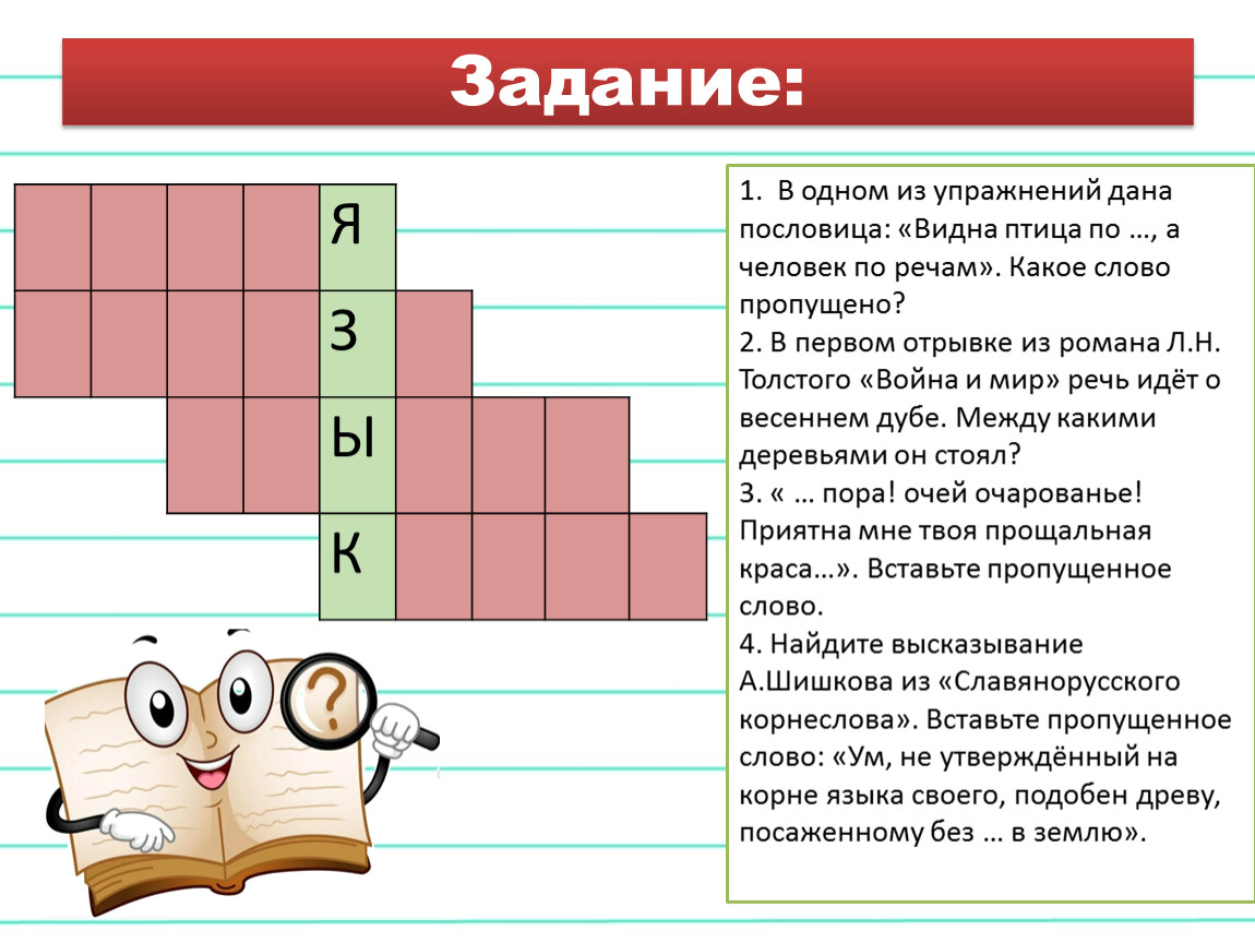 4. Найдите высказывание А.Шишкова из «Славянорусского корнеслова». Вставьте пропущенное слово: «Ум, не утверждённый на корне языка своего, подобен древу, посаженному без … в землю».