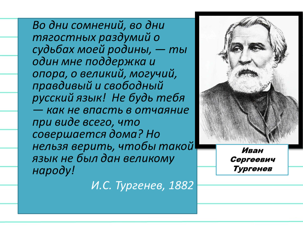 Во дни сомнений, во дни тягостных раздумий о судьбах моей родины, — ты один мне поддержка и опора, о великий, могучий, правдивый и свободный русский язык! Не будь тебя — как не впасть в отчаяние при виде всего, что совершается дома? Но нельзя верить, чтобы такой язык не был дан великому народу!