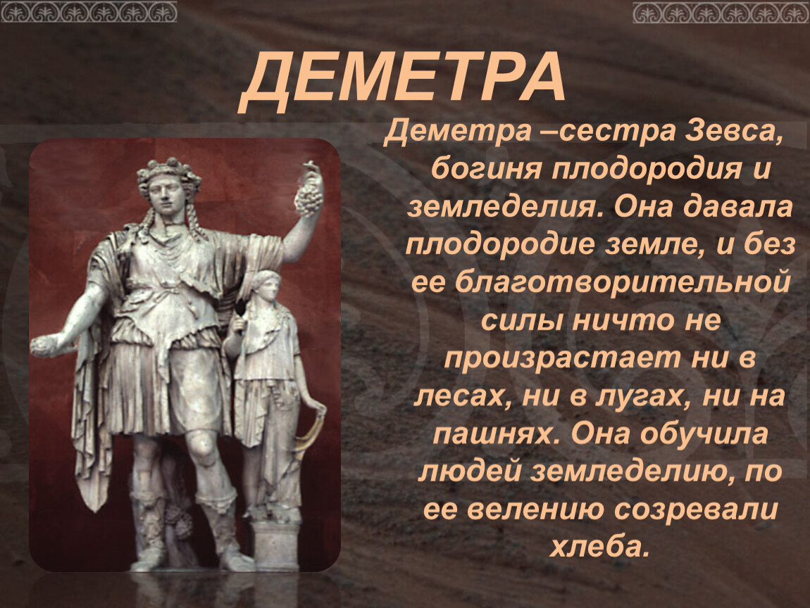 Деметра –сестра Зевса, богиня плодородия и земледелия. Она давала плодородие земле, и без ее благотворительной силы ничто не произрастает ни в лесах, ни в лугах, ни на пашнях. Она обучила людей земледелию, по ее велению созревали хлеба.