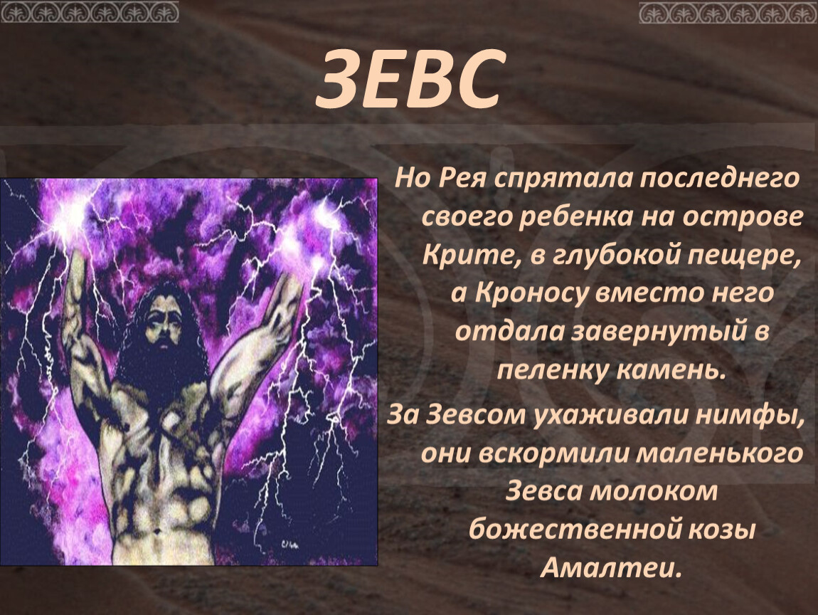 За Зевсом ухаживали нимфы, они вскормили маленького Зевса молоком божественной козы Амалтеи.