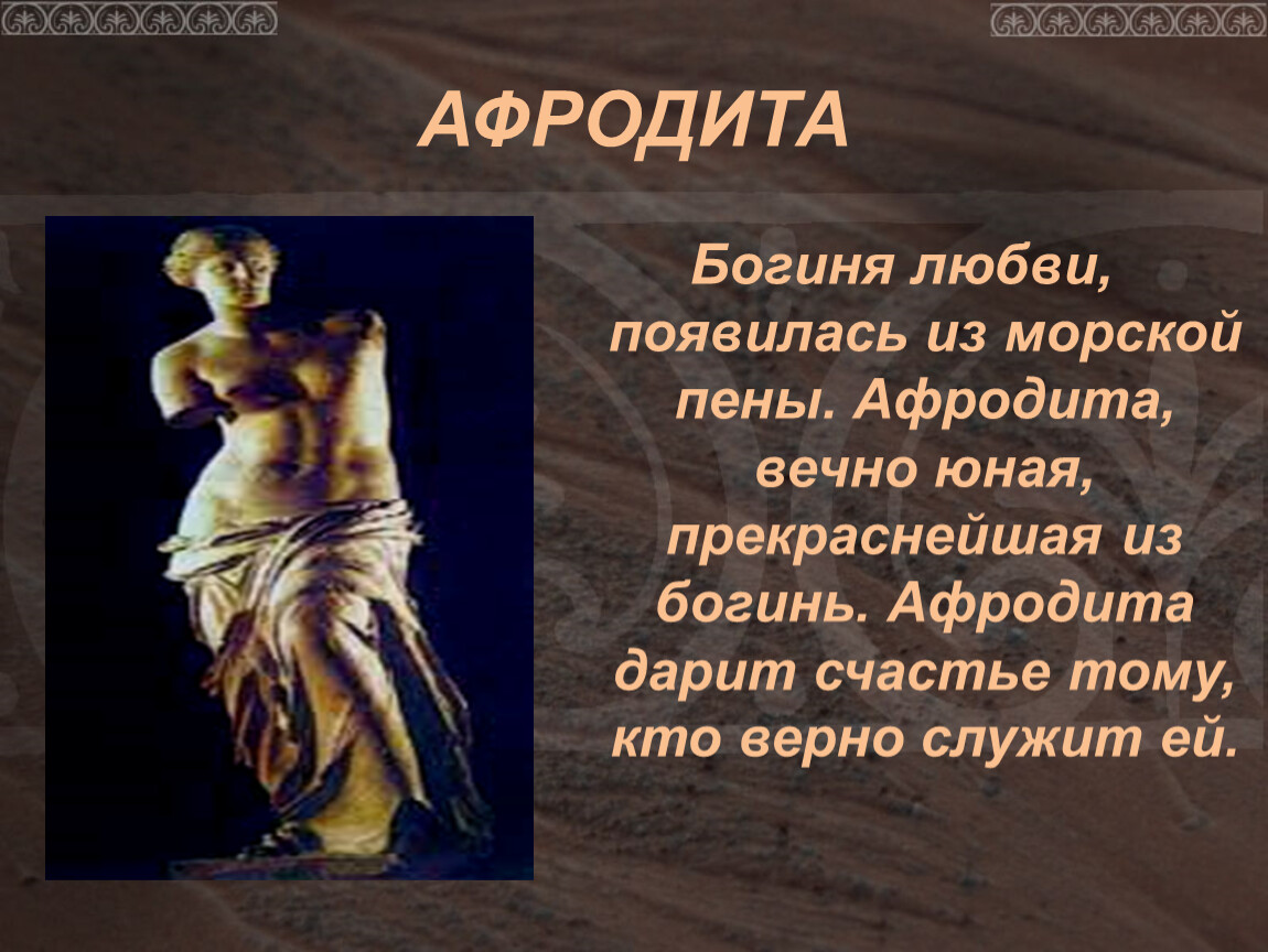 Богиня любви, появилась из морской пены. Афродита, вечно юная, прекраснейшая из богинь. Афродита дарит счастье тому, кто верно служит ей.