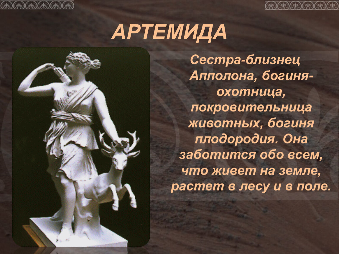 Сестра-близнец Апполона, богиня-охотница, покровительница животных, богиня плодородия. Она заботится обо всем, что живет на земле, растет в лесу и в поле.
