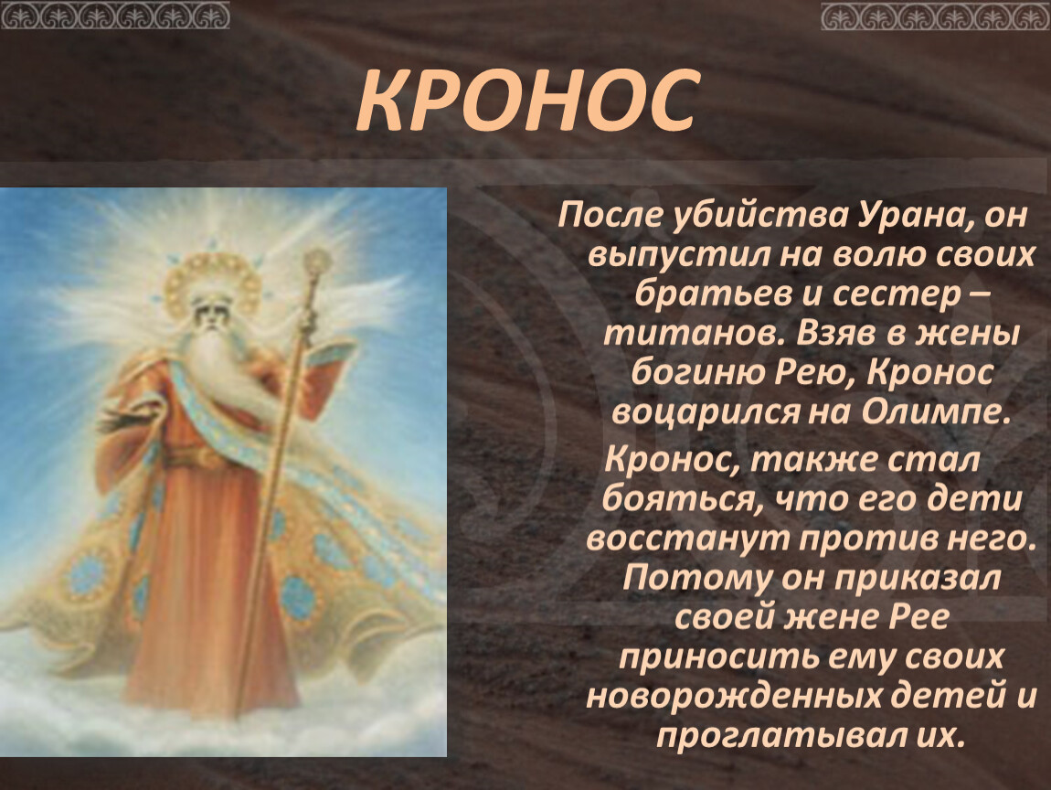 После убийства Урана, он выпустил на волю своих братьев и сестер – титанов. Взяв в жены богиню Рею, Кронос воцарился на Олимпе.