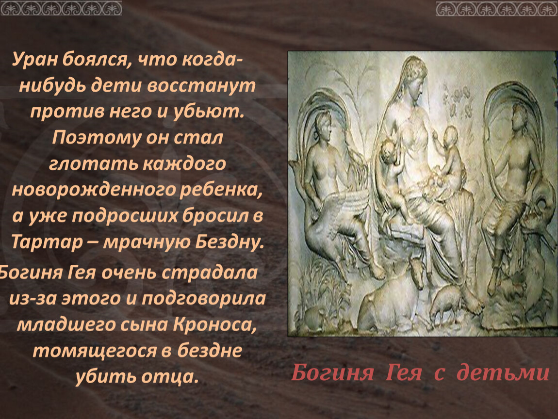 Богиня Гея очень страдала из-за этого и подговорила младшего сына Кроноса, томящегося в бездне убить отца.