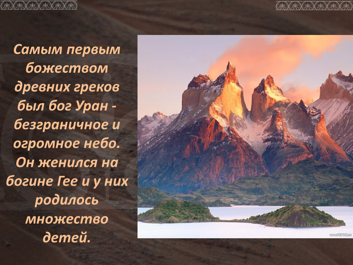 Самым первым божеством древних греков был бог Уран - безграничное и огромное небо. Он женился на богине Гее и у них родилось множество детей.