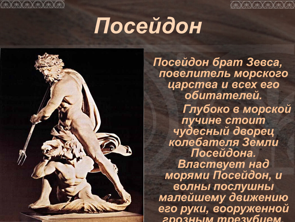 Посейдон брат Зевса, повелитель морского царства и всех его обитателей.