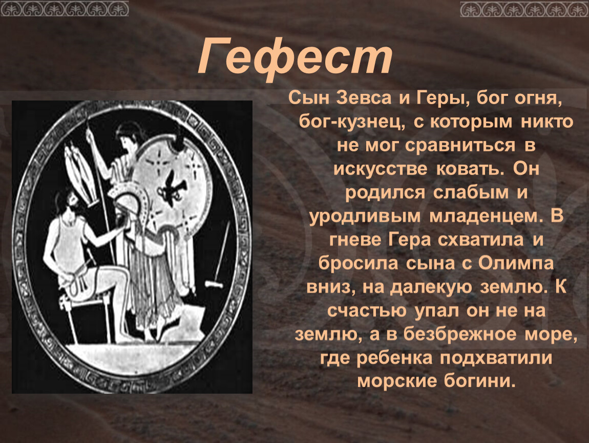 Сын Зевса и Геры, бог огня, бог-кузнец, с которым никто не мог сравниться в искусстве ковать. Он родился слабым и уродливым младенцем. В гневе Гера схватила и бросила сына с Олимпа вниз, на далекую землю. К счастью упал он не на землю, а в безбрежное море, где ребенка подхватили морские богини.