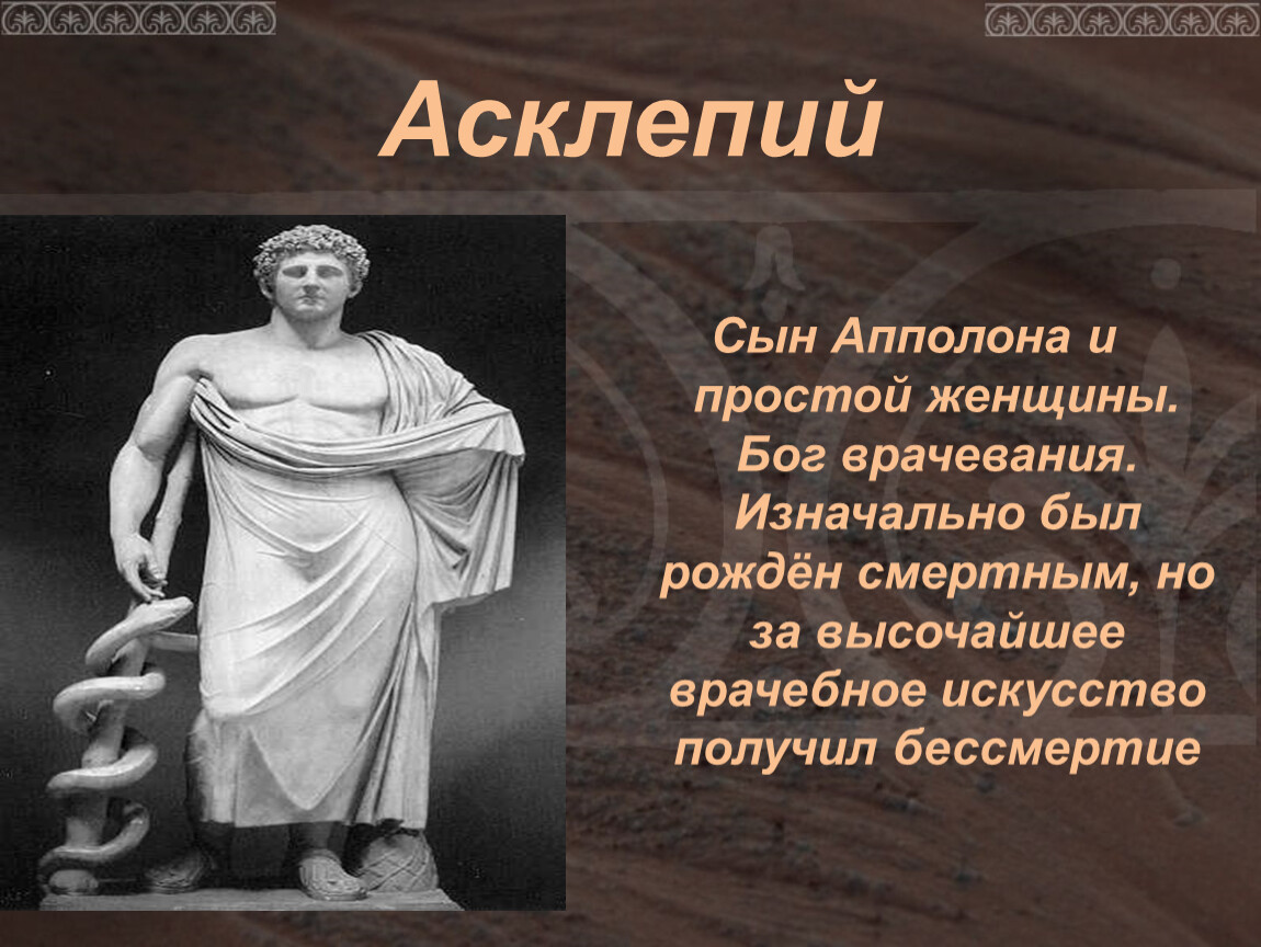 Сын Апполона и простой женщины. Бог врачевания. Изначально был рождён смертным, но за высочайшее врачебное искусство получил бессмертие