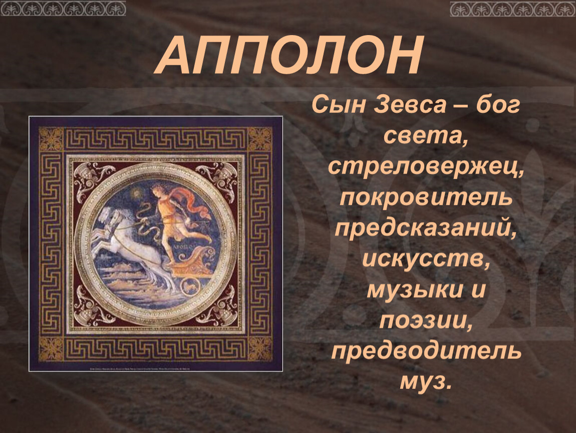 Сын Зевса – бог света, стреловержец, покровитель предсказаний, искусств, музыки и поэзии, предводитель муз.