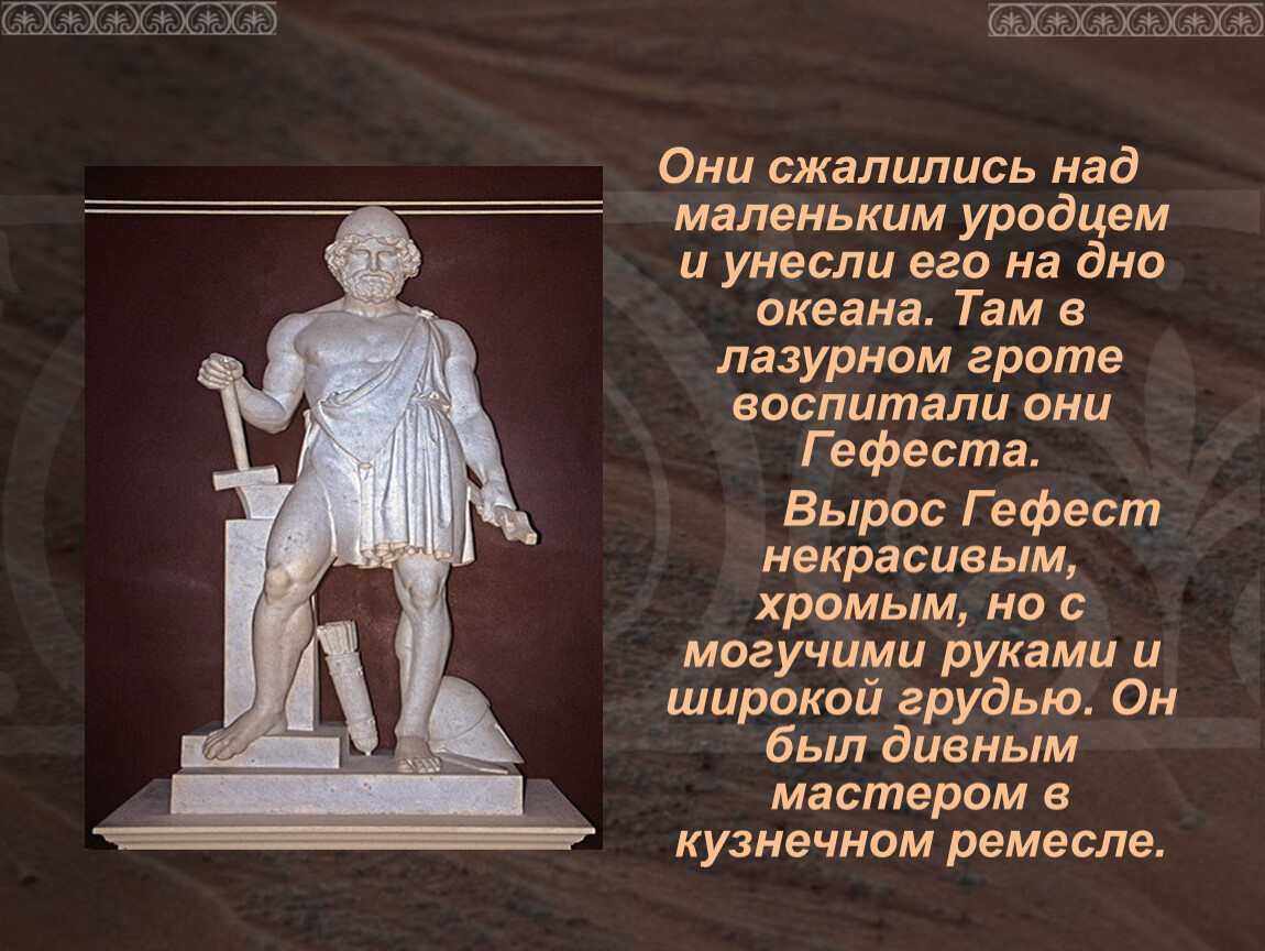 Они сжалились над маленьким уродцем и унесли его на дно океана. Там в лазурном гроте воспитали они Гефеста.