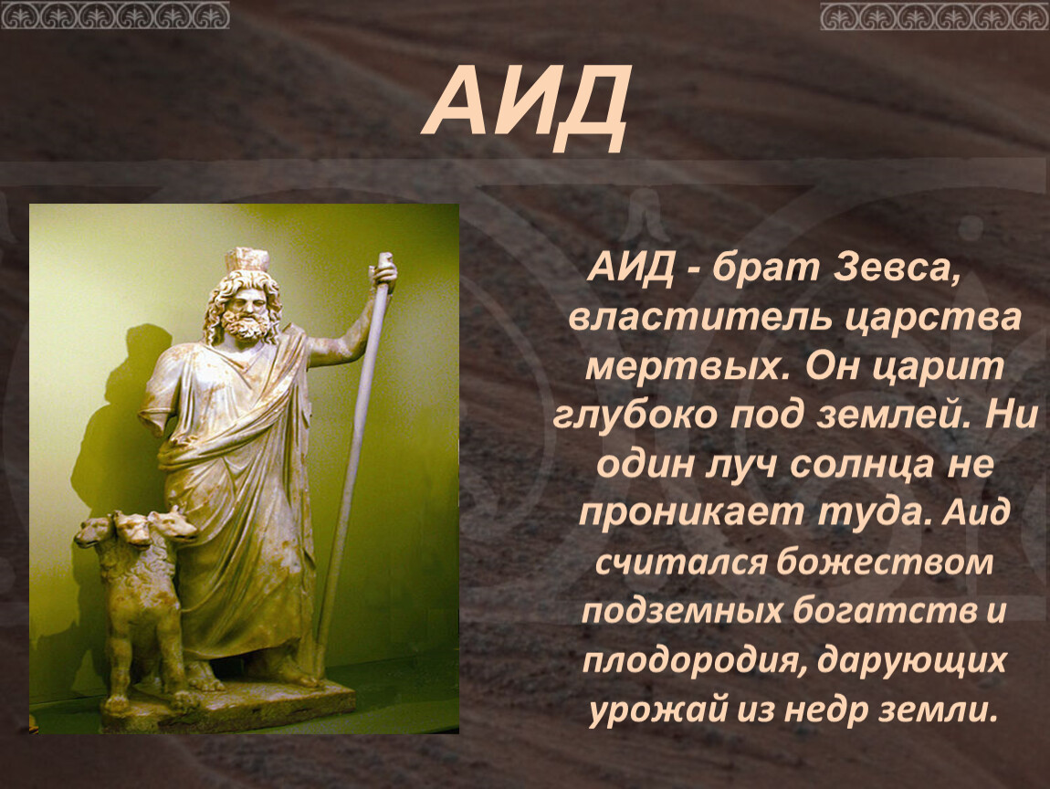 АИД - брат Зевса, властитель царства мертвых. Он царит глубоко под землей. Ни один луч солнца не проникает туда. Аид считался божеством подземных богатств и плодородия, дарующих урожай из недр земли.