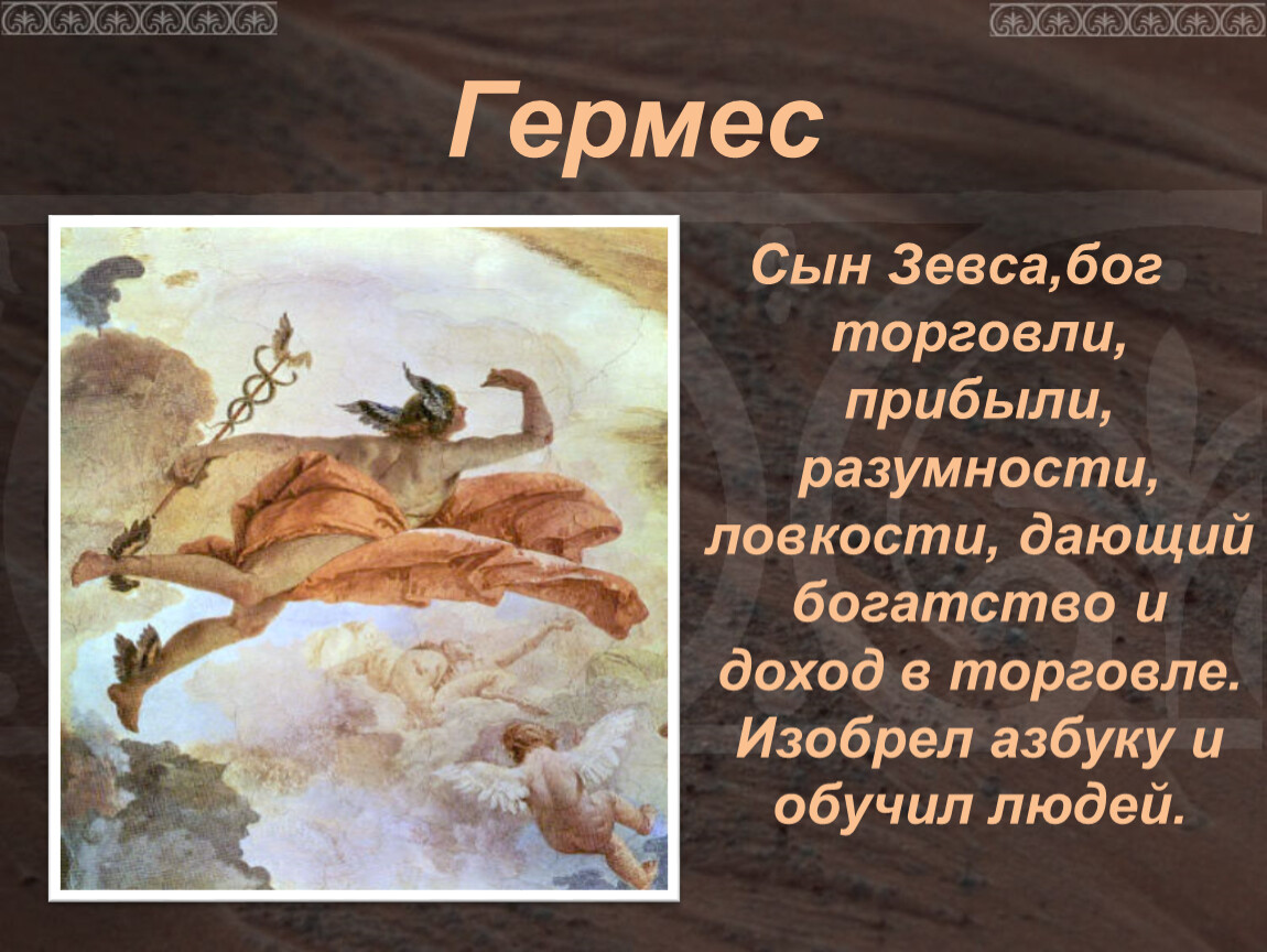Сын Зевса,бог торговли, прибыли, разумности, ловкости, дающий богатство и доход в торговле. Изобрел азбуку и обучил людей.