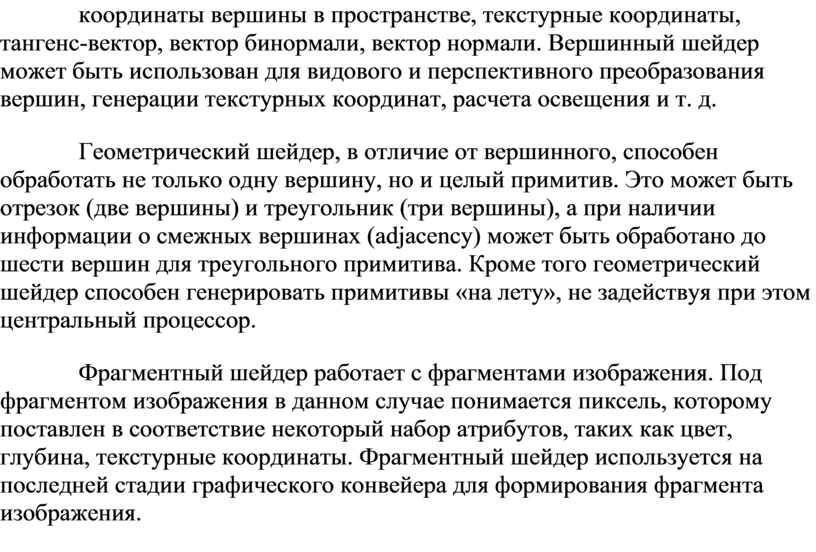 Фрагментный шейдер работает с фрагментами изображения. Под фрагментом изображения в данном случае понимается пиксель, которому поставлен в соответствие некоторый набор атрибутов, таких как цвет, глубина, текстурные координаты. Фрагментный шейдер используется на последней стадии графического конвейера для формирования фрагмента изображения.