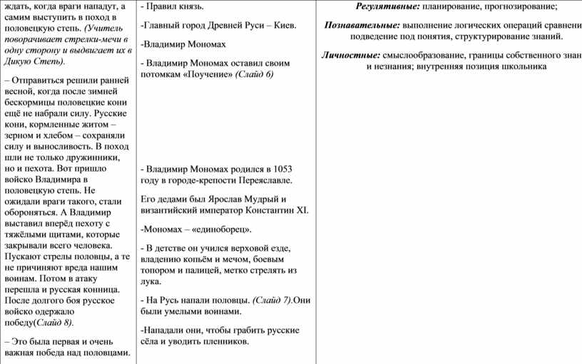 - Владимир Мономах родился в 1053 году в городе-крепости Переяславле. Его дедами был Ярослав Мудрый и византийский император Константин XI. -Мономах – «единоборец». - В детстве он учился верховой езде, владению копьём и мечом, боевым топором и палицей, метко стрелять из лука. - На Русь напали половцы. (Слайд 7).Они были умелыми воинами. -Нападали они, чтобы грабить русские сёла и уводить пленников. - Владимир Мономах построил крепость Любеч. -Он стал князем в Киеве, когда ему исполнилось 60 лет. Его уважали за справедливость и милосердие. За годы его правления расцвели литература и искусство, были изданы новые законы, защищающие простых людей