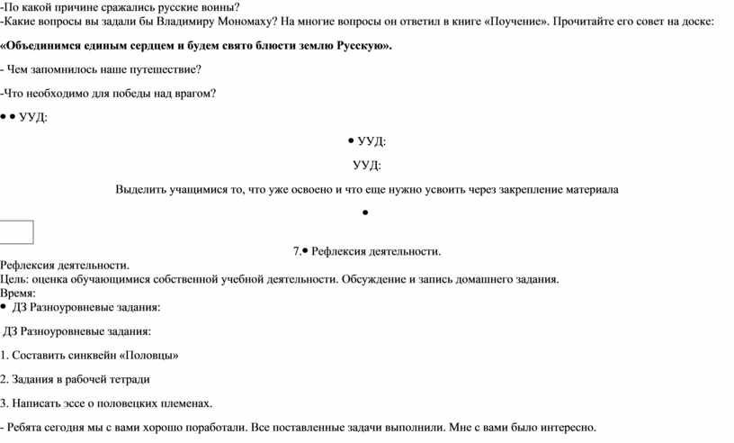 ЦЕЛЬ УРОКА: формирование условий для знакомства с причинами возникновения войн, борьбой русских князей с половцами под руководством Владимира Мономаха.