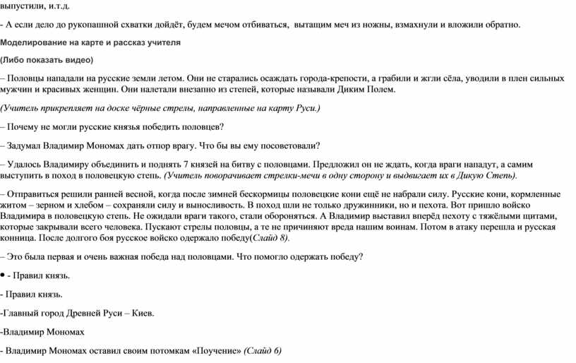 ФИЗКУЛЬТМИНУТКА (ВЫХОДИТ ОДИН УЧЕНИК И ПОКАЗЫВАЕТ) -Давайте представим, что у нас есть машина времени, и мы можем отправиться в 12 век. Сейчас мы на границе Руси и половецкой степью. Здесь наши богатыри несут дозор, а мы смогли стать на защиту родины как они? На слайдах у меня есть подсказки. - Стоим в дозоре, посмотрели на лево, вглядываемся в даль, посмотрели на право, вглядываемся в даль. Пока нет половцев, потренируемся в стрельбе из лука. Достали стрелу из колчана, натянули тетиву, выпустили стрелу, взяли стрелу выпустили, и.т.д. - А если дело до рукопашной схватки дойдёт, будем мечом отбиваться, вытащим меч из ножны, взмахнули и вложили обратно. Моделирование на карте и рассказ учителя (Либо показать видео) – Половцы нападали на русские земли летом. Они не старались осаждать города-крепости, а грабили и жгли сёла, уводили в плен сильных мужчин и красивых женщин. Они налетали внезапно из степей, которые называли Диким Полем. (Учитель прикрепляет на доске чёрные стрелы, направленные на карту Руси.) – Почему не могли русские князья победить половцев? – Задумал Владимир Мономах дать отпор врагу. Что бы вы ему посоветовали? – Удалось Владимиру объединить и поднять 7 князей на битву с половцами. Предложил он не ждать, когда враги нападут, а самим выступить в поход в половецкую степь. (Учитель поворачивает стрелки-мечи в одну сторону и выдвигает их в Дикую Степь). – Отправиться решили ранней весной, когда после зимней бескормицы половецкие кони ещё не набрали силу. Русские кони, кормленные житом – зерном и хлебом – сохраняли силу и выносливость. В поход шли не только дружинники, но и пехота. Вот пришло войско Владимира в половецкую степь. Не ожидали враги такого, стали обороняться. А Владимир выставил вперёд пехоту с тяжёлыми щитами, которые закрывали всего человека. Пускают стрелы половцы, а те не причиняют вреда нашим воинам. Потом в атаку перешла и русская конница. После долгого боя русское войско одержало победу(Слайд 8). – Это была первая и очень важная победа над половцами. Что помогло одержать победу?