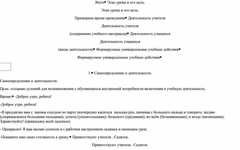 Самоопределение к деятельности. Цель: создание условий для возникновения у обучающихся внутренней потребности включения в учебную деятельность. Время: |