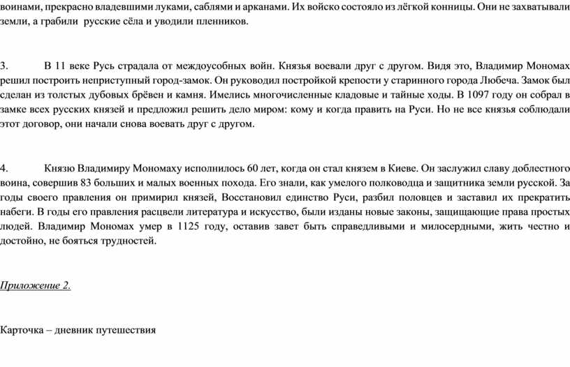 1. Владимир Мономах родился в городе-крепости Переяславле в 1053 году. Его дедом был легендарный князь Ярослав Мудрый. Своим прозванием – Мономах – он обязан другому деду – суровому византийскому императору Константину IХ Мономаху, что по- гречески означает «единоборец». С ранних лет его учили искусству верховой езды, умению владеть всеми видами оружия: копьём и мечом, боевым топором и палицей, метко стрелять из лука. Владимир любил охоту, рыбную ловлю и чтение книг.