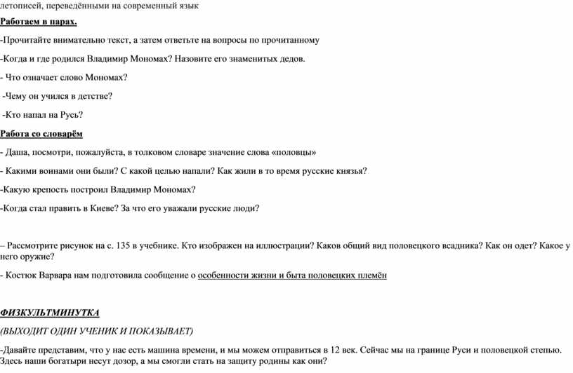 – Наша машина переносит нас в XII век. Кто правил Русью? - Давайте мы с вами определим , как же звали князя, посмотрите на слайд (шапка Монамаха). Что вы видите? -Посмотрите на карту Руси. Назовите главный город того времени. -Вы узнаете о князе Владимире Мономахе и его борьбе с врагами Руси. Что вы уже знаете об этом князе? – Возьмите листы с отрывками из летописей, переведёнными на современный язык Работаем в парах. -Прочитайте внимательно текст, а затем ответьте на вопросы по прочитанному -Когда и где родился Владимир Мономах? Назовите его знаменитых дедов. - Что означает слово Мономах? -Чему он учился в детстве? -Кто напал на Русь? Работа со словарём - Даша, посмотри, пожалуйста, в толковом словаре значение слова «половцы» - Какими воинами они были? С какой целью напали? Как жили в то время русские князья? -Какую крепость построил Владимир Мономах? -Когда стал править в Киеве? За что его уважали русские люди?