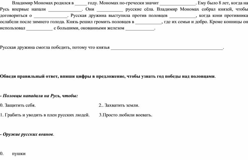 Владимир Мономах родился в _____ году. Мономах по-гречески значит _______________. Ему было 8 лет, когда на Русь впервые напали ______________. Они ___________ русские сёла. Владимир Мономах собрал князей, чтобы договориться о ______________. Русская дружина выступила против половцев ___________, когда кони противника ослабели после зимнего голода. Князь решил громить половцев в ___________, где их семьи и добро. Кроме конницы он использовал ___________ с большими, окованными железом ____________.