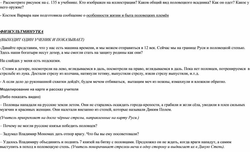 – Рассмотрите рисунок на с. 135 в учебнике. Кто изображен на иллюстрации? Каков общий вид половецкого всадника? Как он одет? Какое у него оружие? - Костюк Варвара нам подготовила сообщение о особенности жизни и быта половецких племён