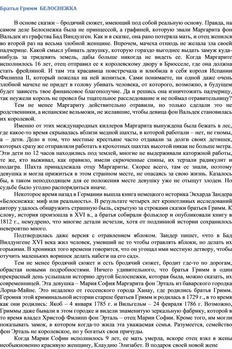 В основе сказки – бродячий сюжет, имеющий под собой реальную основу. Правда, на самом деле Белоснежка была не принцессой, а графиней, которую звали Маргарита фон Вальдек из графства Бад Виндулген. Как и в сказке, она рано потеряла мать, и отец женился во второй раз на весьма злобной женщине. Впрочем, мачеха отнюдь не желала зла своей падчерице. Какой смысл убивать девушку, которую гораздо выгоднее выдать замуж куда-нибудь за тридевять земель, дабы больше никогда не видеть ее. Когда Маргарите исполнилось 16 лет, отец отправил ее к королевскому двору в Брюсселе, где она должна стать фрейлиной. И там эта красавица повстречала и влюбила в себя короля Испании Филиппа II, который пожелал на ней жениться. Сами понимаете, ни одной даже очень злобной мачехе не придет в голову убивать человека, от которого, возможно, в будущем будет зависеть твое финансовое благополучие. Да и решись она изничтожить падчерицу, так неужели король не провел бы тщательное расследование и не поймал отравительницу?