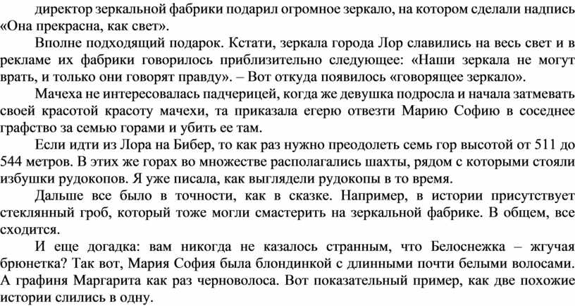 Дальше все было в точности, как в сказке. Например, в истории присутствует стеклянный гроб, который тоже могли смастерить на зеркальной фабрике. В общем, все сходится.