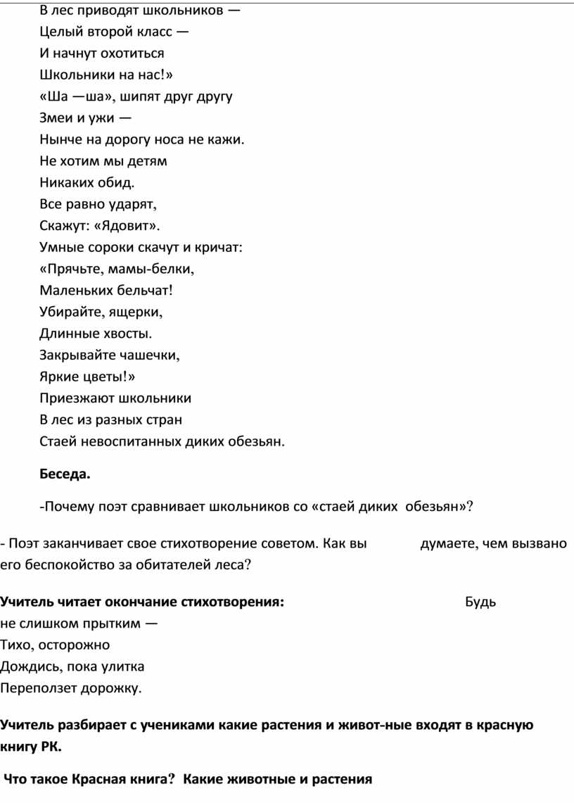 Подарок учителя. Чтение стихотворения Н. В. Хаткина «Экскурсия». Заметался в панике Беседа. -Почему поэт сравнивает школьников со «стаей диких обезьян»? - Поэт заканчивает свое стихотворение советом. Как вы думаете, чем вызвано его беспокойство за обитателей леса? Учитель читает окончание стихотворения: Будь не слишком прытким — Учитель разбирает с учениками какие растения и живот-ные входят в красную книгу РК. Что такое Красная книга? Какие животные и растения входят в Красную книгу РК? В красную книгу в мире? Показывает видео «Берегите природу». |