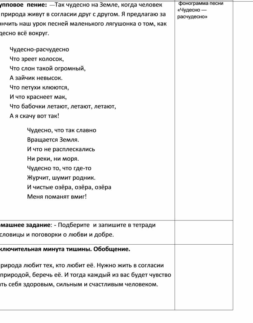 Групповое пение: —Так чудесно на Земле, когда человек и природа живут в согласии друг с другом. Я предлагаю за -кончить наш урок песней маленького лягушонка о том, как чудесно всё вокруг. Чудесно-расчудесно Чудесно, что так славно