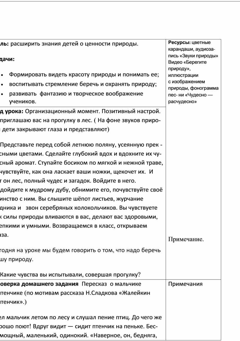 Ресурсы: цветные карандаши, аудиоза- пись «Звуки природы» Видео «Берегите природу», иллюстрации с изображением природы, фонограмма пес- ни «Чудесно — расчудесно»