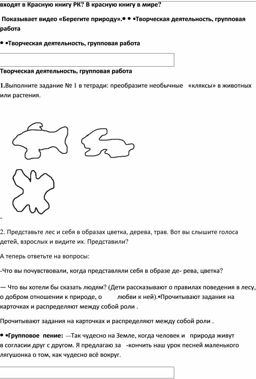 Творческая деятельность, групповая работа 1.Выполните задание № 1 в тетради: преобразите необычные «кляксы» в животных или растения.