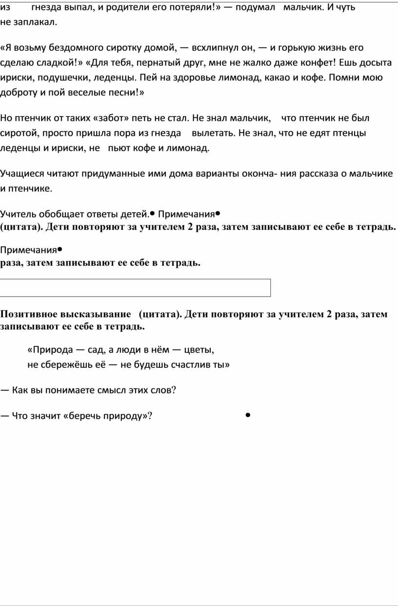 Позитивное высказывание (цитата). Дети повторяют за учителем 2 раза, затем записывают ее себе в тетрадь. «Природа — сад, а люди в нём — цветы, — Как вы понимаете смысл этих слов? — Что значит «беречь природу»? |