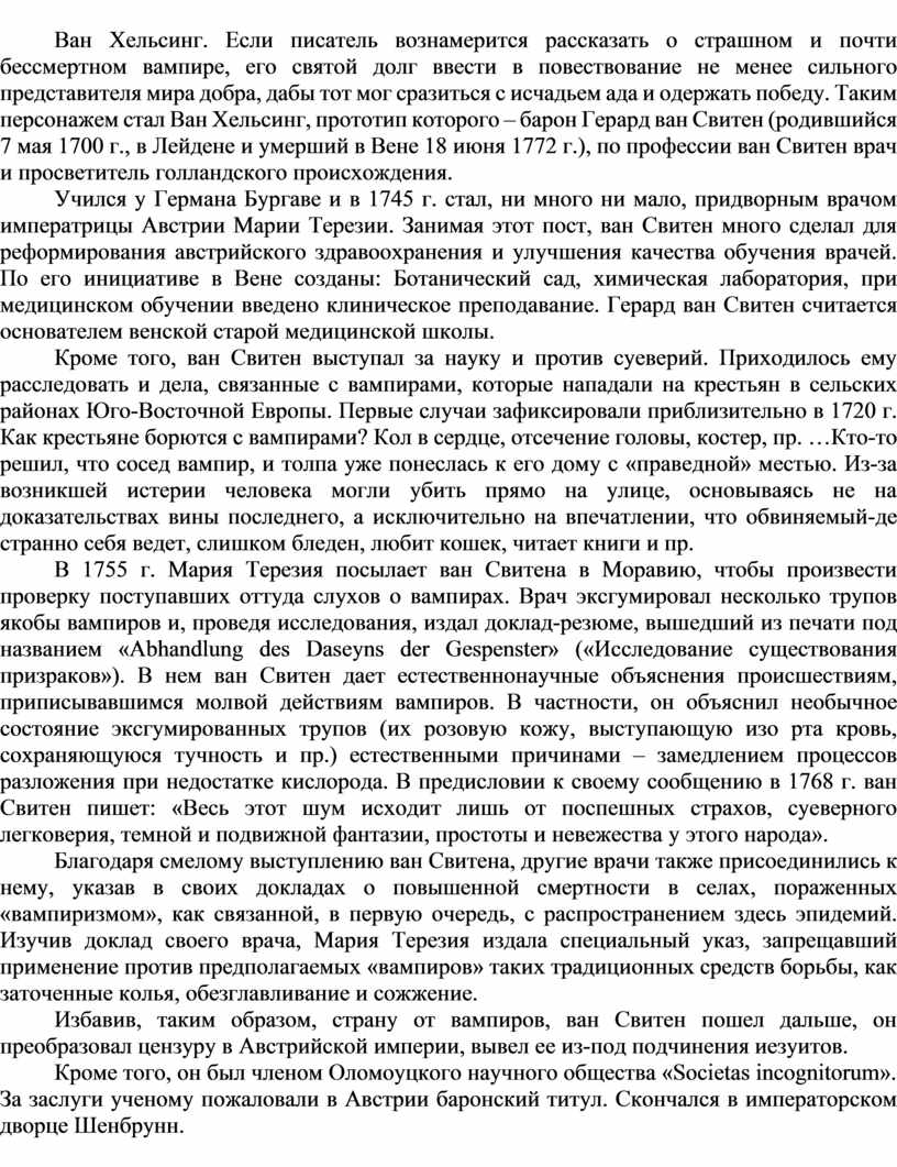 Ван Хельсинг. Если писатель вознамерится рассказать о страшном и почти бессмертном вампире, его святой долг ввести в повествование не менее сильного представителя мира добра, дабы тот мог сразиться с исчадьем ада и одержать победу. Таким персонажем стал Ван Хельсинг, прототип которого – барон Герард ван Свитен (родившийся 7 мая 1700 г., в Лейдене и умерший в Вене 18 июня 1772 г.), по профессии ван Свитен врач и просветитель голландского происхождения.