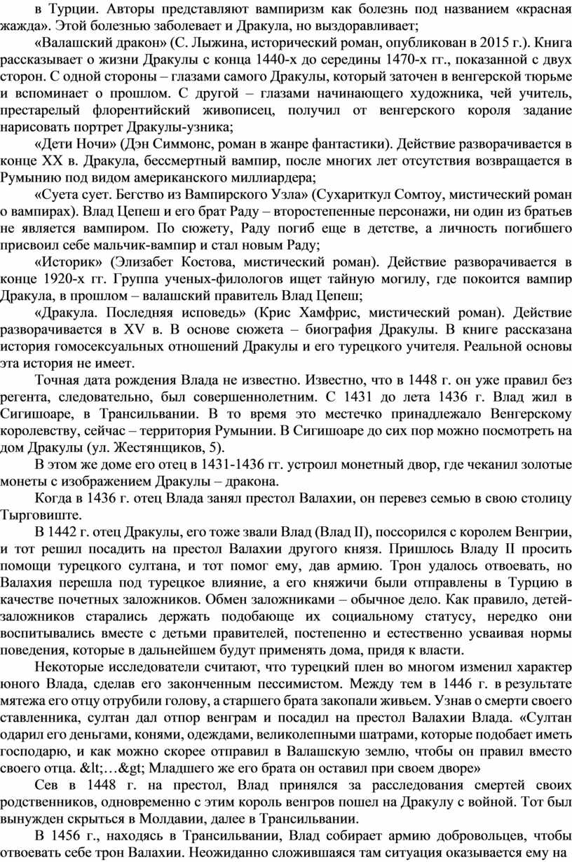 «Историк» (Элизабет Костова, мистический роман). Действие разворачивается в конце 1920-х гг. Группа ученых-филологов ищет тайную могилу, где покоится вампир Дракула, в прошлом – валашский правитель Влад Цепеш;