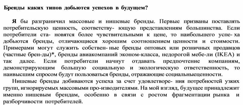 Нишевые бренды добиваются успеха за счет удовлетворе ния потребностей узких групп, игнорируемых массовыми про изводителями. На мой взгляд, будущее принадлежит именно нишевым брендам, особенно в связи с ростом фрагментации рынка и разборчивости потребителей.