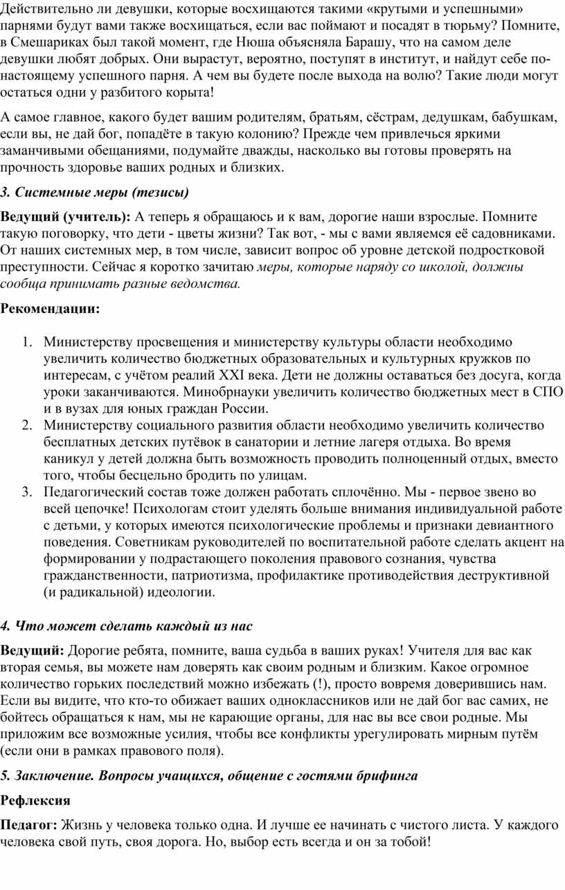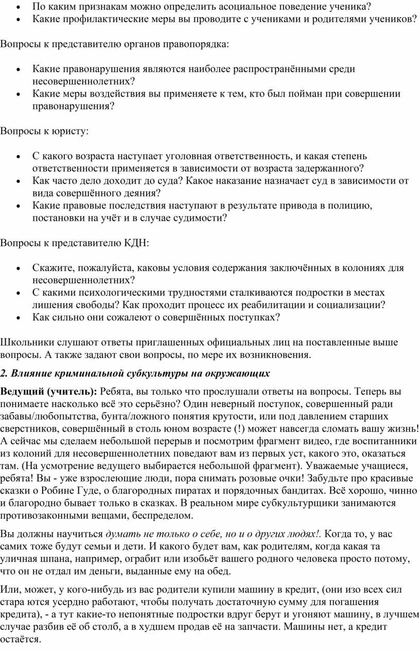 Ведущий (учитель): Ребята, вы только что прослушали ответы на вопросы. Теперь вы понимаете насколько всё это серьёзно? Один неверный поступок, совершенный ради забавы/любопытства, бунта/ложного понятия крутости, или под давлением старших сверстников, совершённый в столь юном возрасте (!) может навсегда сломать вашу жизнь! А сейчас мы сделаем небольшой перерыв и посмотрим фрагмент видео, где воспитанники из колоний для несовершеннолетних поведают вам из первых уст, какого это, оказаться там. (На усмотрение ведущего выбирается небольшой фрагмент). Уважаемые учащиеся, ребята! Вы - уже взрослеющие люди, пора снимать розовые очки! Забудьте про красивые сказки о Робине Гуде, о благородных пиратах и порядочных бандитах. Всё хорошо, чинно и благородно бывает только в сказках. В реальном мире субкультурщики занимаются противозаконными вещами, беспределом.
