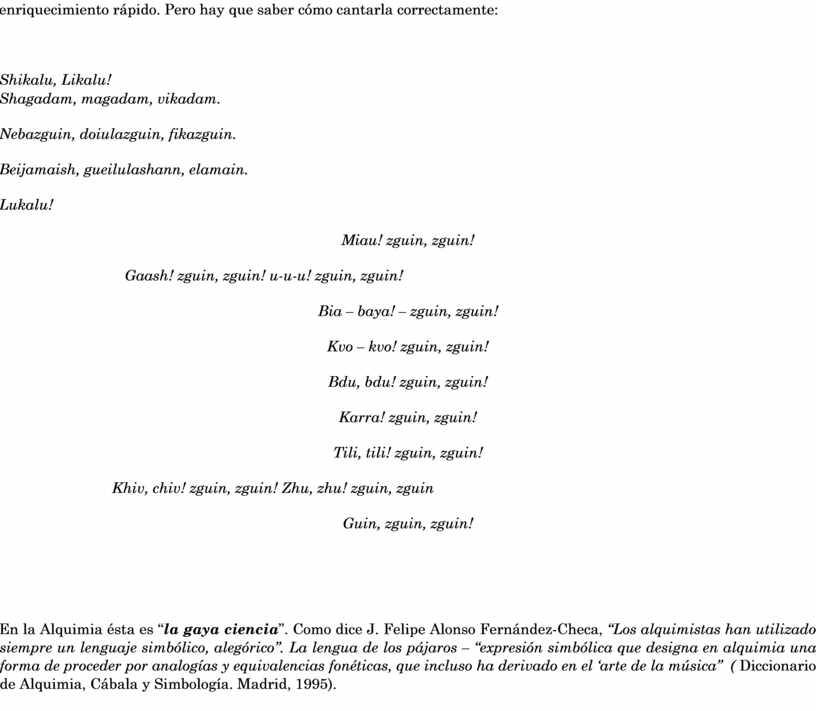 En la Alquimia ésta es “la gaya ciencia”. Como dice J. Felipe Alonso Fernández-Checa, “Los alquimistas han utilizado siempre un lenguaje simbólico, alegórico”. La lengua de los pájaros – “expresión simbólica que designa en alquimia una forma de proceder por analogías y equivalencias fonéticas, que incluso ha derivado en el ‘arte de la música” ( Diccionario de Alquimia, Cábala y Simbología. Madrid, 1995).