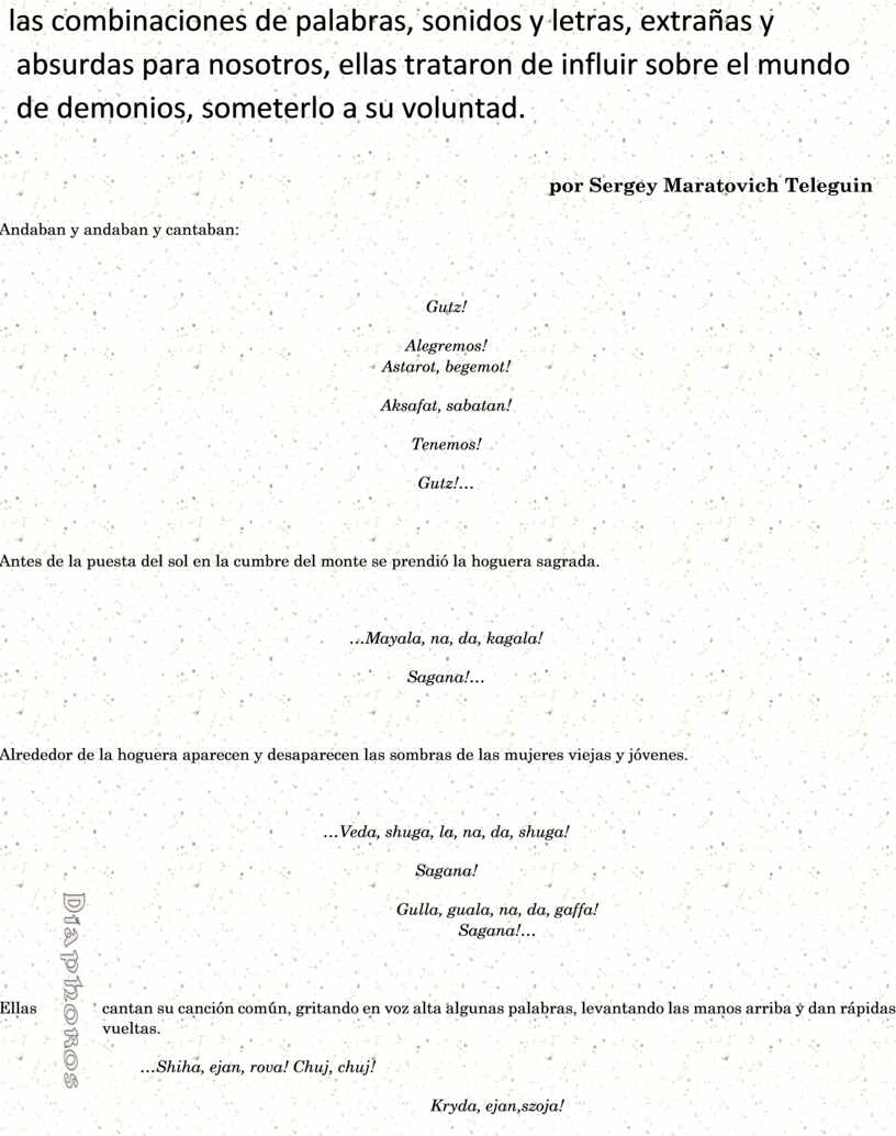 “En casa – guillo magal – estaba sentada la Virgen del Sol. Ni palacio de oro – chingafa – buscaba la Virgen, ni un joven vigoroso de Novgorod se acercaba, sino se acercó un Dragón que vomita fuego. – Lif lif zanzapa kalapunda. La escama que tenía el Dragón no fue hecha ni de oro ni de cobre, los adornos fueron hechos ni de perlas, el gorro no fue rojo y la flecha no fue del baúl del abuelo. – Pizapo fukadalimo koroitalima kanafo. – “Polkan, Polkan! Mate al Dragón de fuego, defienda la hermosura de la Virgen del Sol” – Vijadima guillo mogal diraf. – El Dragón de fuego volaba desde el mar de Khvalyn a una aldea lejana, al palacio de la Virgen. Un joven vigoroso – Shiyala shibulda kochilla baraichijo doytsofo kiraja dina. – En un jardín de frambuesa en la cama del Volga está acostada la Virgen muerta, con el agua viva, con la suegra y el suegro rencorosos. Fue matado el Dragón de fuego, se diseminó su escama sobre el mar de Khvalyn, sobre el bosque de Murom. – Yanija moydega biraja vigdo – Atacó un tártaro malo y aprisionó a la Virgen del Sol, la trajo a la Orda de oro al Mamai brutal y pagano. – Uajama shirofo”.