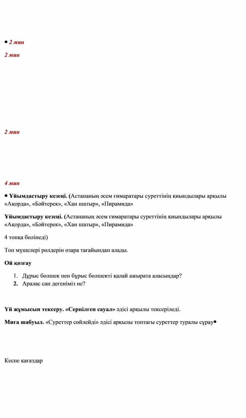 Ұйымдастыру кезеңі. (Астананың әсем ғимаратары суреттінің қиындылары арқылы «Ақорда», «Бәйтерек», «Хан шатыр», «Пирамида» 4 топқа бөлінеді) Топ мүшелері рөлдерін өзара тағайындап алады. Ой қозғау 1. Дұрыс бөлшек пен бұрыс бөлшекті қалай ажырата аласыңдар? 2. Аралас сан дегеніміз не?