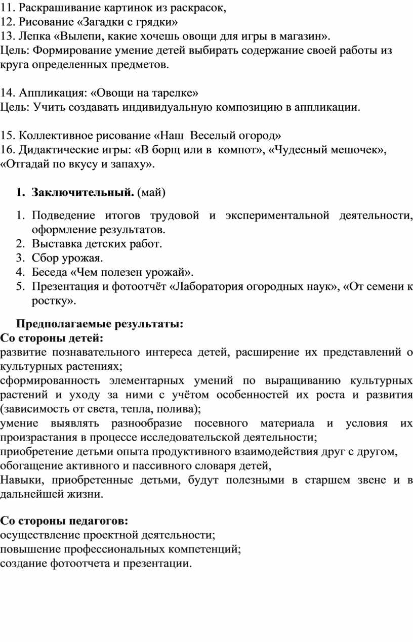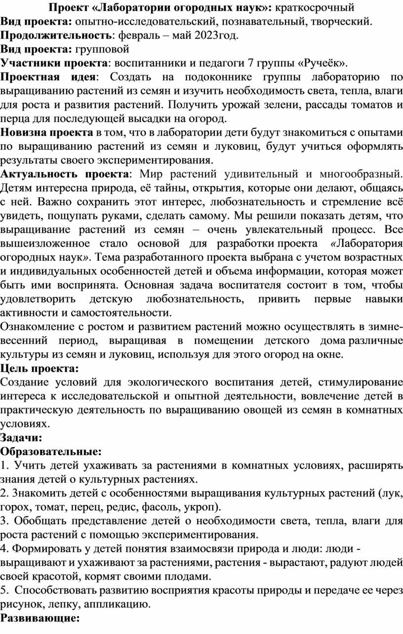 Актуальность проекта: Мир растений удивительный и многообразный. Детям интересна природа, её тайны, открытия, которые они делают, общаясь с ней. Важно сохранить этот интерес, любознательность и стремление всё увидеть, пощупать руками, сделать самому. Мы решили показать детям, что выращивание растений из семян – очень увлекательный процесс. Все вышеизложенное стало основой для разработки проекта «Лаборатория огородных наук». Тема разработанного проекта выбрана с учетом возрастных и индивидуальных особенностей детей и объема информации, которая может быть ими воспринята. Основная задача воспитателя состоит в том, чтобы удовлетворить детскую любознательность, привить первые навыки активности и самостоятельности.