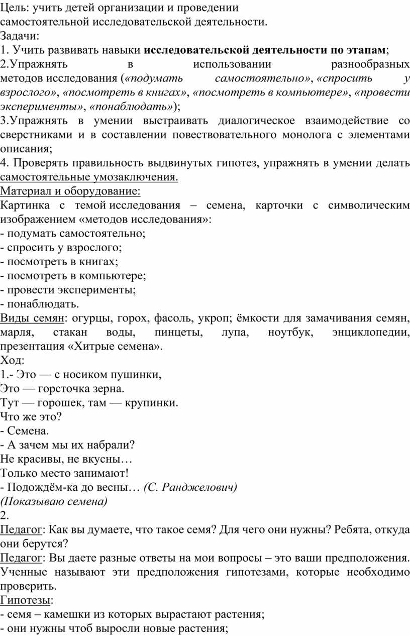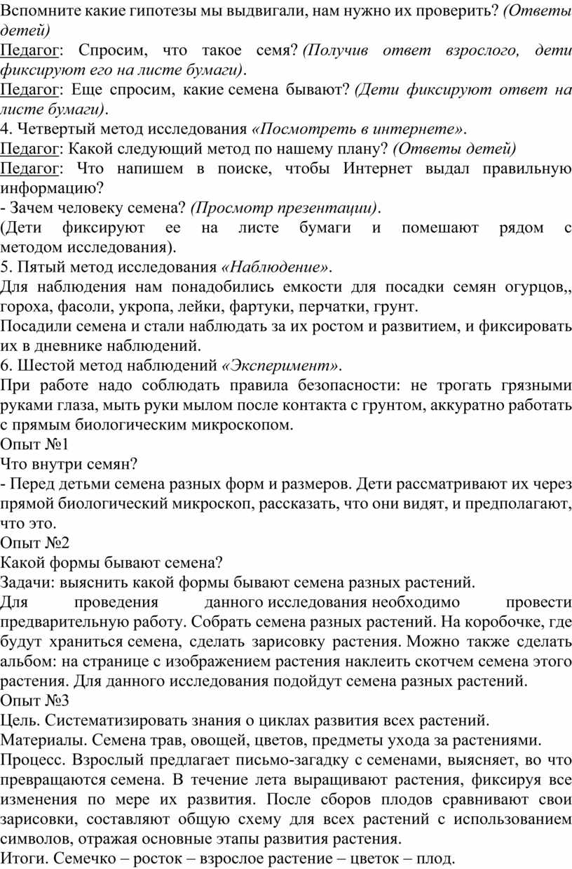 Процесс. Взрослый предлагает письмо-загадку с семенами, выясняет, во что превращаются семена. В течение лета выращивают растения, фиксируя все изменения по мере их развития. После сборов плодов сравнивают свои зарисовки, составляют общую схему для всех растений с использованием символов, отражая основные этапы развития растения.