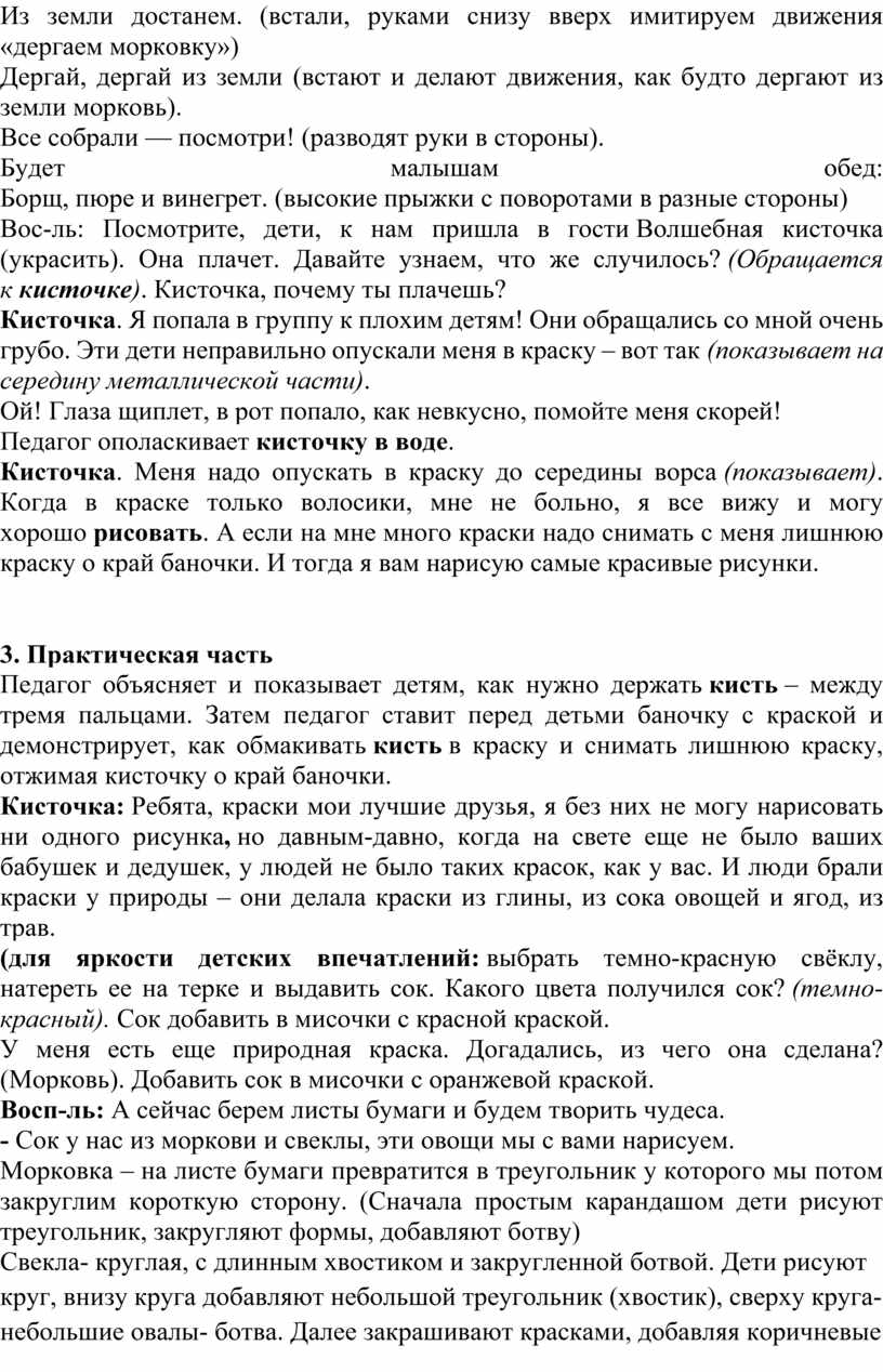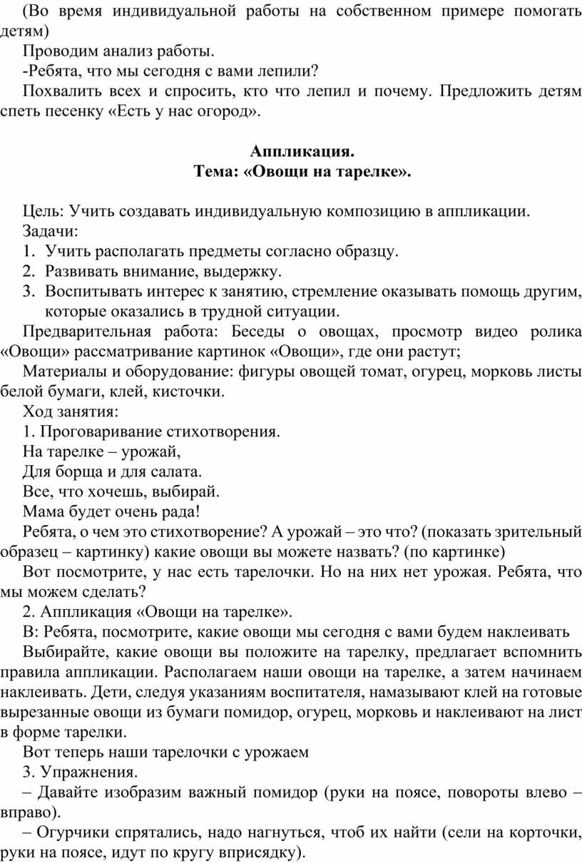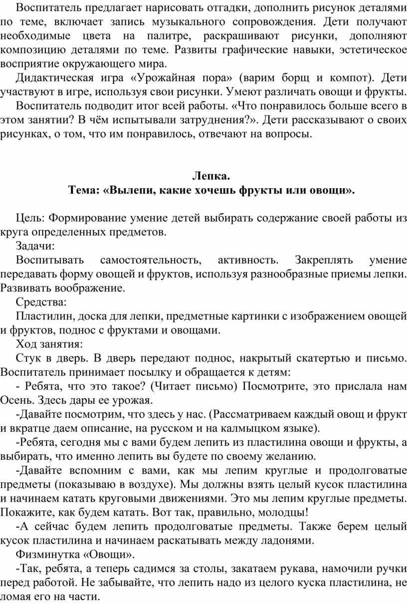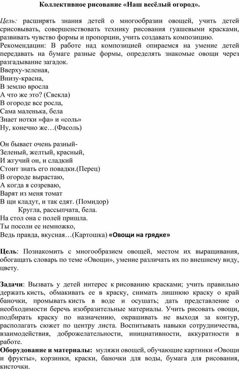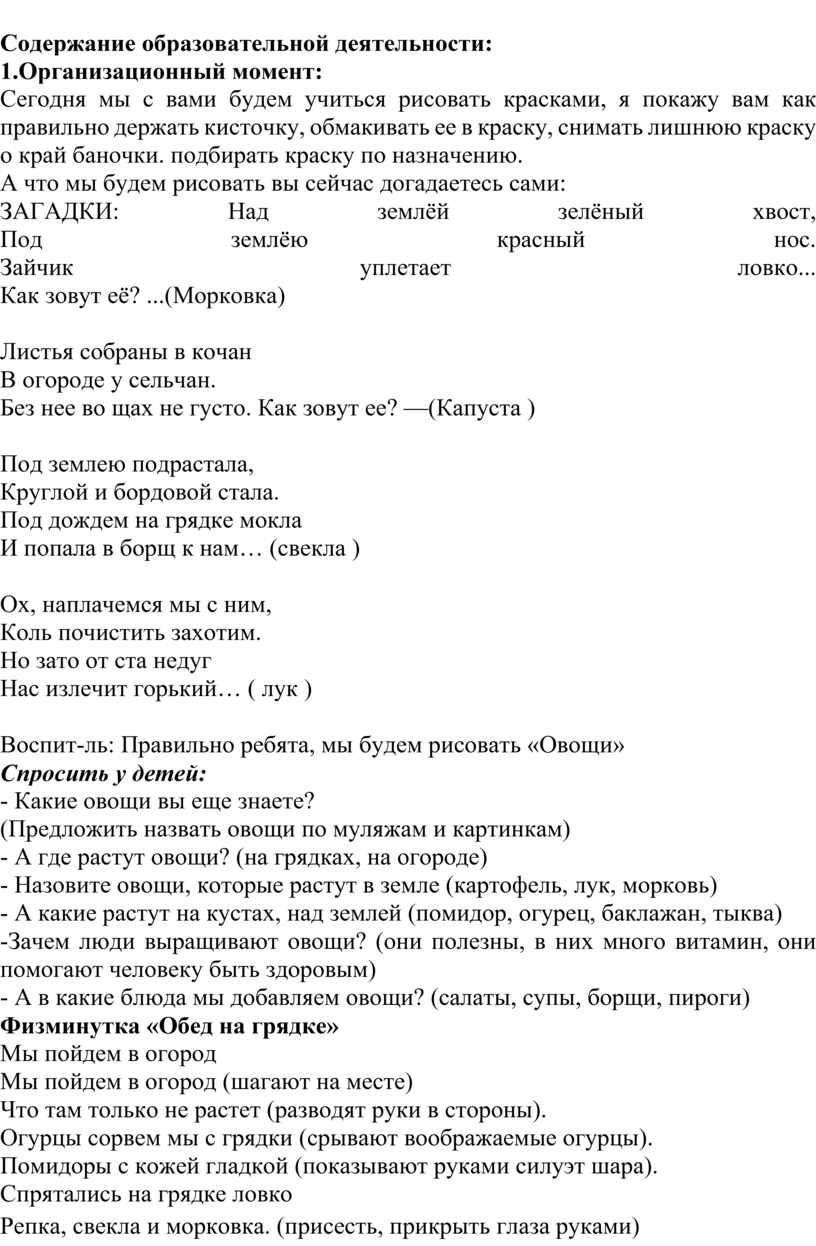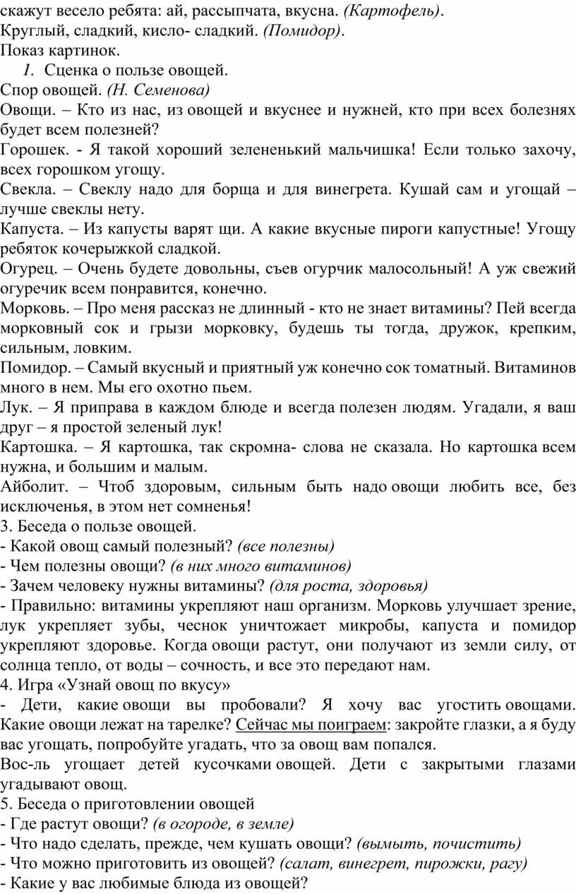1.Формирование представлений детей о характерных свойствах овощей (форма, цвет, вкус, особенности поверхности, о пользе для организма человека, о способах употребления в пищу.